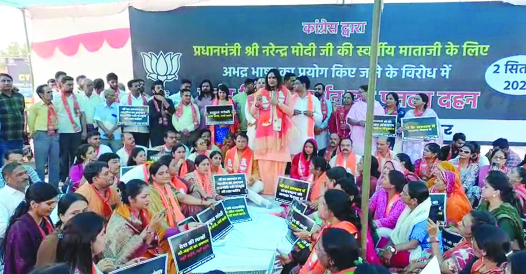 जयपुर में भाजपा ने 2 सितम्बर 2025 को छोटी चौपड़ पर धरना प्रदर्शन किया। बिहार में प्रधानमंत्री नरेंद्र मोदी की मां के खिलाफ अपशब्दों पर भाजपा में आक्रोश है। प्रदर्शन में राहुल गांधी और तेजस्वी यादव के पुतले जलाए गए। अरुण चतुर्वेदी, अशोक परनामी, बालमुकुंदाचार्य और कुसुम यादव सहित कई नेता मौजूद थे। कार्यकर्ताओं ने नारे लगाते हुए दोषियों के खिलाफ सख्त कार्रवाई और कांग्रेस-राजद से माफी की मांग की।
