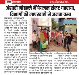 सवाई माधोपुर, (रॉयल पत्रिका)। रॉयल पत्रिका द्वारा 3 और 4 मई को प्रकाशित की गई विशेष खबर का सकारात्मक असर देखने को मिला है। शहर के अंसारी मोहल्ले में बीते 15 दिनों से पूरी तरह ठप पड़ी पेयजल आपूर्ति और बिजली की समस्या पर जब पत्रिका ने प्रमुखता से आवाज उठाई, तो संबंधित विभाग हरकत में आ गया। गौरतलब है कि अंसारी मौहल्ले में गर्मी के मौसम में हर वर्ष पानी और बिजली की समस्या गंभीर रूप ले लेती है, लेकिन इस बार रॉयल पत्रिका ने इस जनसमस्या को व्यापक कवरेज देते हुए प्रशासन और संबंधित अधिकारियों तक पहुंचाया। समाचार प्रकाशित होने के 24 घंटे के भीतर प्रशासन ने तत्परता दिखाई और शनिवार रात को मौहल्ले में नई डीपी लगाई गई। इसके साथ ही सोमवार को पेयजल आपूर्ति भी बहाल कर दी गई। स्थानीय निवासियों ने राहत की सांस ली है और रॉयल पत्रिका व प्रशासन का आभार जताया है। इस कार्यवाही से न केवल आमजन को राहत मिली है बल्कि यह भी सिद्ध हुआ है कि मीडिया की भूमिका समाज के लिए कितनी प्रभावशाली और निर्णायक हो सकती है। जिला प्रशासन और विभागीय अधिकारियों ने समस्या का शीघ्र समाधान कर अपनी कार्यकुशलता और उत्तरदायित्व का उत्कृष्ट परिचय दिया है।
