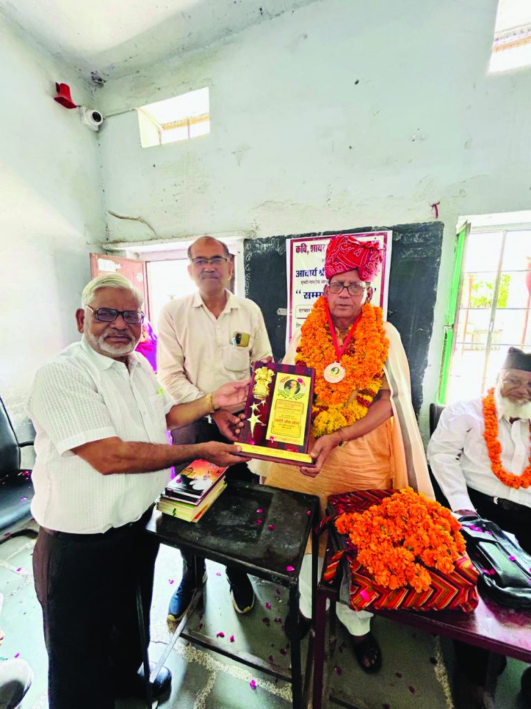 झोटवाड़ा/जयपुर, (रॉयल पत्रिका)। कवि, शायर एवं प्रबुद्ध जन मंच द्वारा दरबार पब्लिक सीनियर सेकेंडरी स्कूल में राष्ट्रीय एकता कवि सम्मेलन संपन्न हुआ जिसमें मुजफ्फर नगर यूपी से आए कवि आचार्य होतीलाल शर्मा का  संस्था अध्यक्ष छोटू खान द्वारा शॉल साफा, पुष्प हारों से सम्मान कर शील्ड व मेडल भेंट किए गए।
