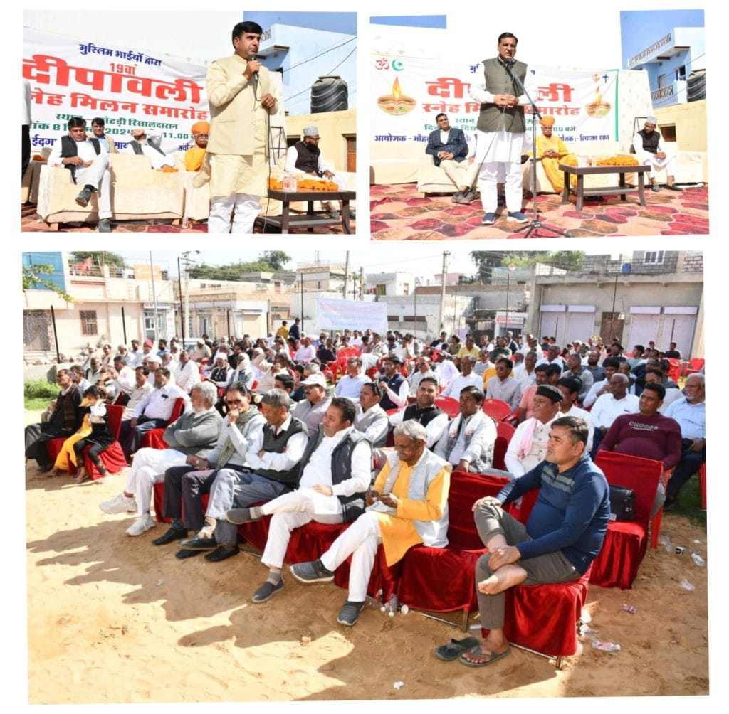 चूरू(रॉयल पत्रिका)। जिला मुख्यालय स्थित वार्ड नं. 58 ईदगाह मोहल्ला में ईदगाह वेलफेयर सोसायटी की ओर से कोटड़ी रिसालदारान में रियाजत अली खान एवं मुस्लिम समाज की ओर से भव्य सामाजिक सरोकार एवं सामाजिक समरसता की भावना के साथ दिपावली स्नेह मिलन समारोह का सफल आयोजन किया गया। समारोह में सांप्रदायिक सद्भाव के लिए मशहूर चूरू में अनूठा नजारा देखने को मिला, जब मुस्लिम भाइयों की ओर से आयोजित दिवाली स्नेह मिलन में जुटे विभिन्न धर्म-संप्रदायों से जुड़े लोगों ने जोश ओ खरोश से शिरकत की और एक-दूसरे को दिवाली की शुभकामनाएं दीं। समारोह की अध्यक्षता युग निर्माण योजना के संयोजक गुरूदेव रामसिंह राठौड़ ने की तथा समारोह के अतिथि चूरू विधायक हरलाल सहारण, फतेहपुर विधायक हाकम अली खान,  सुजानगढ़ विधायक मनोज मेघवाल, भाजपा जिलाध्यक्ष अध्यक्ष बंसत शर्मा, राजस्थान साहित्य अकादमी के पूर्व अध्यक्ष डॉ. दुलाराम सहारण, सुजानगढ़ सभापति पूर्व प्रतिनिधि इद्रीश गौरी, मौलाना अनिश रजा, मंगतु राम चोटिया,  समाजसेवी महेंद्र चौबे, बंजरग सैन, उमाशंकर शर्मा, हनिफ खान नसवाण, नवाब खां जोईया इत्यादि थे। डॉ. दुलाराम सहारण ने कहा कि चूरू में जिस तरह का सांप्रदायिक सद्भाव है और सामाजिक सौहार्द है, उससे शांति और कानून व्यवस्था बनाए रखने में बहुत मदद मिलती है। उन्होंने कहा कि ऎसे आयोजनों से आपसी भाईचारे और परस्पर सामंजस्य को बल मिलता है। मोलाना अनीश रजा ने कहा कि दुनियाभर की बांटने वाली ताकतें देश के माहौल को खराब करने में जुटी हुई हैं लेकिन हम भारत के सद्भावी लोग कभी माहौल खराब होने नहीं देंगे। उन्होंने शायराना अंदाज में कहा कि यह सियासत की नहीं, फकीरों की धरती है, जहां मुहब्बत पलती है। राजस्थान की इस धरती में आंधियां चलती हैं और खेतों में फसल भले ही बरसात पर निर्भर हो लेकिन यहां इंसानियत की फसल बहुत अच्छी है। भाजपा जिलाध्यक्ष बंसत शर्मा ने कहा कि भले ही पूरी दुनिया में घूम आओ, चूरू आने के बाद जो सुकून मिलता है, वह कहीं भी नहीं है। इसके पीछे चूरू के लोगों का प्रेम और उनकी मिली-जुली संस्कृति ही है। उन्होंने कहा कि चूरू आने के बाद कभी भी उन्हें यह शहर पराया नहीं लगा, सभी धर्मों में अच्छाइयां हैं, हमें उनको अपनाना चाहिए ।